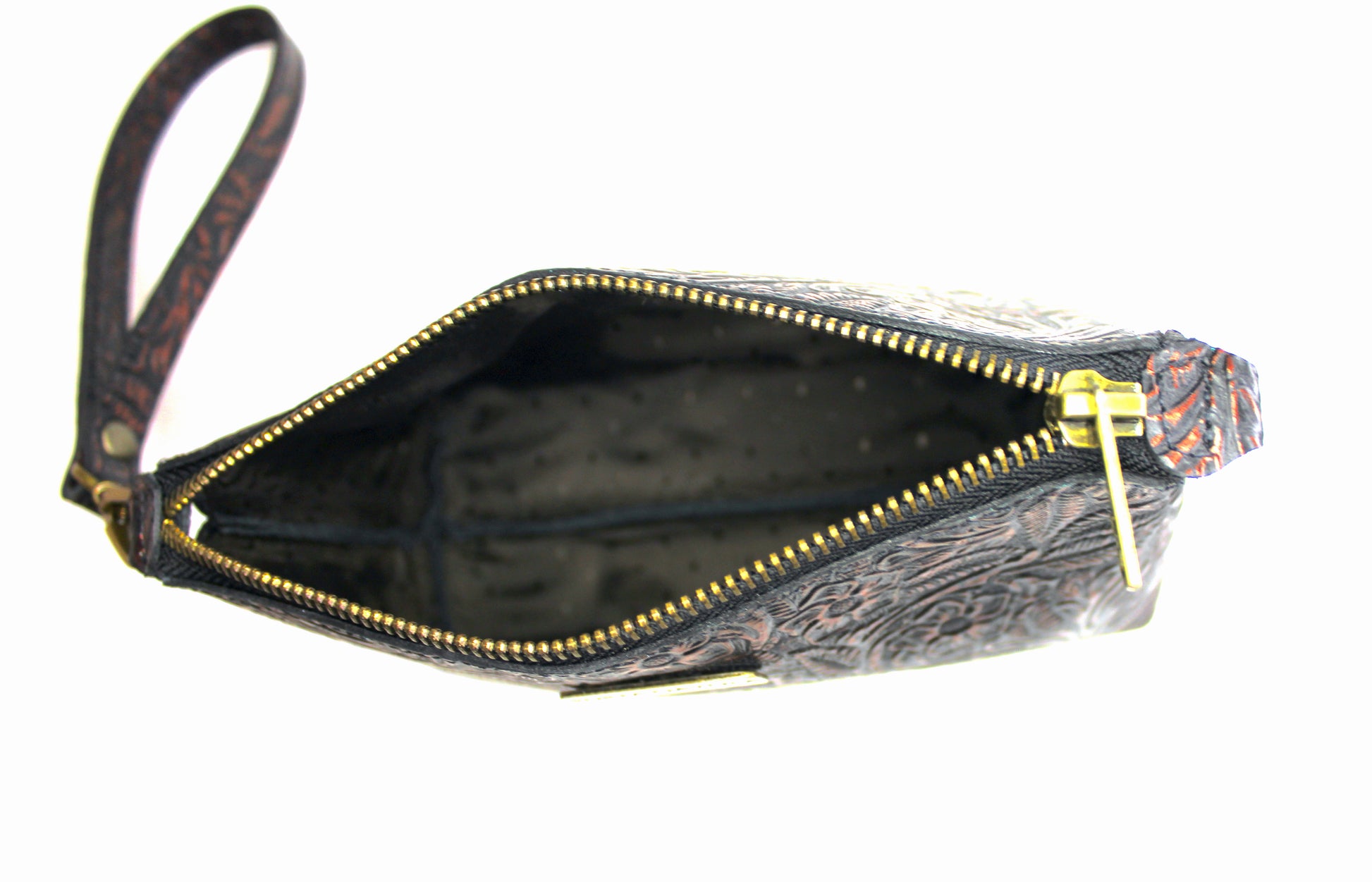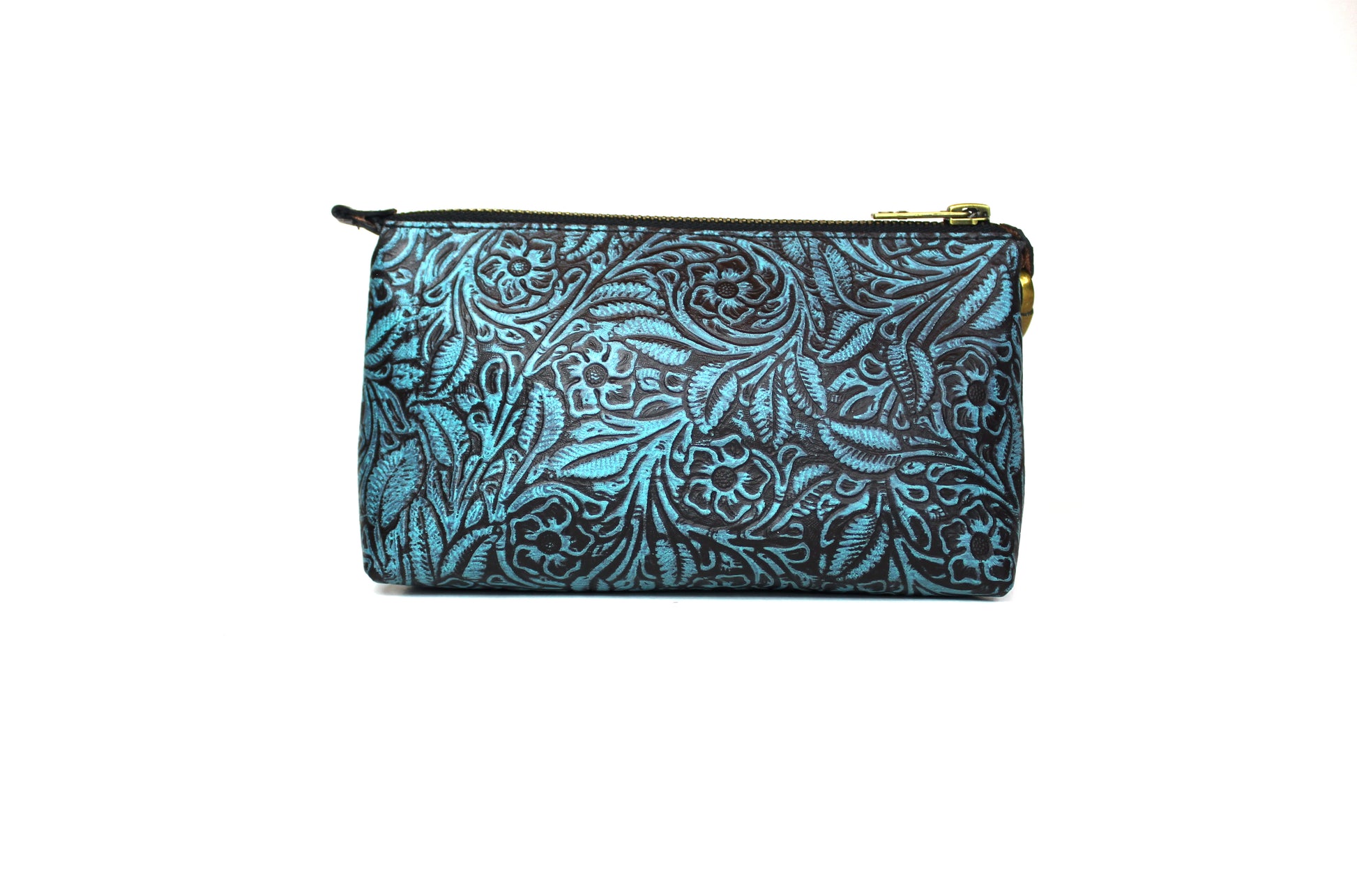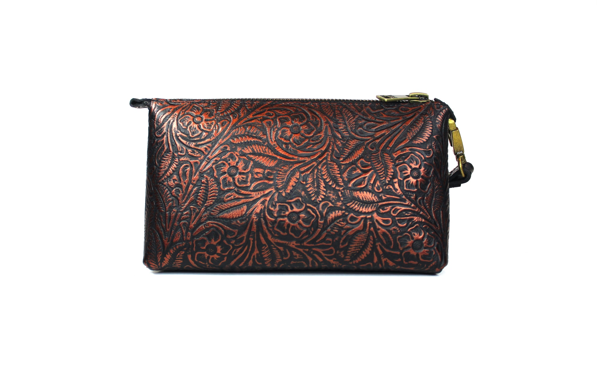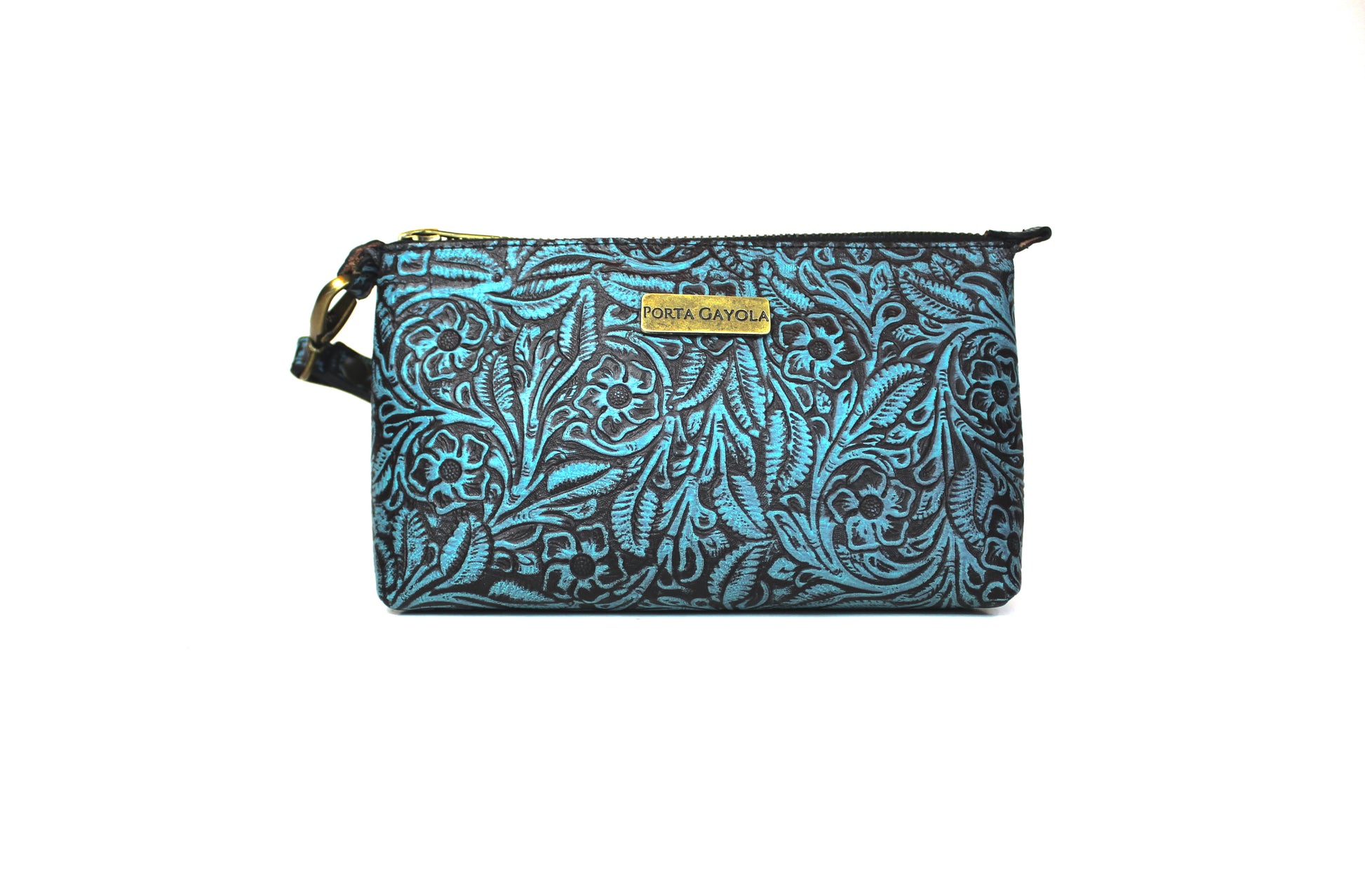 Cosmetiquera con doble oreja para muñequera de piel, en el exterior elaborada con piel grabada y entintada artesanalmente con los 4 colores de nuestra colección.