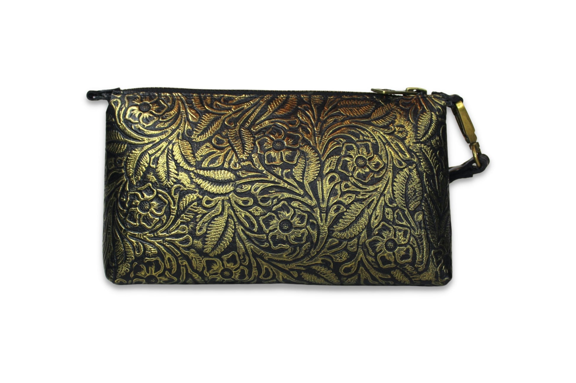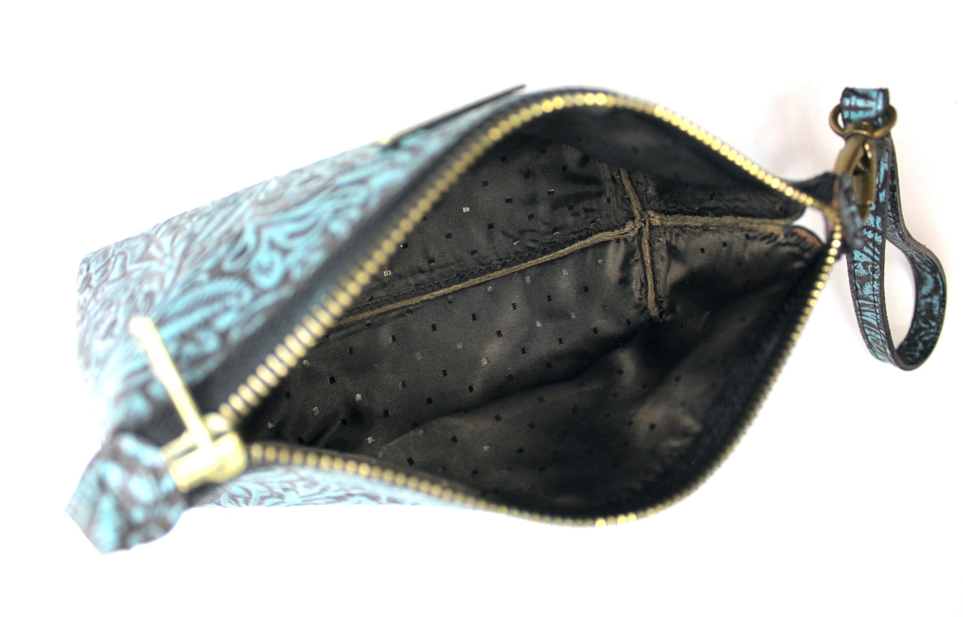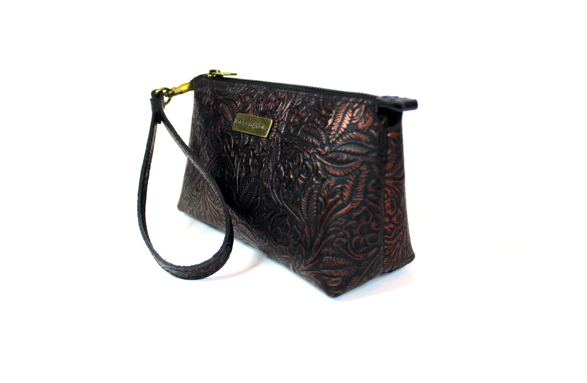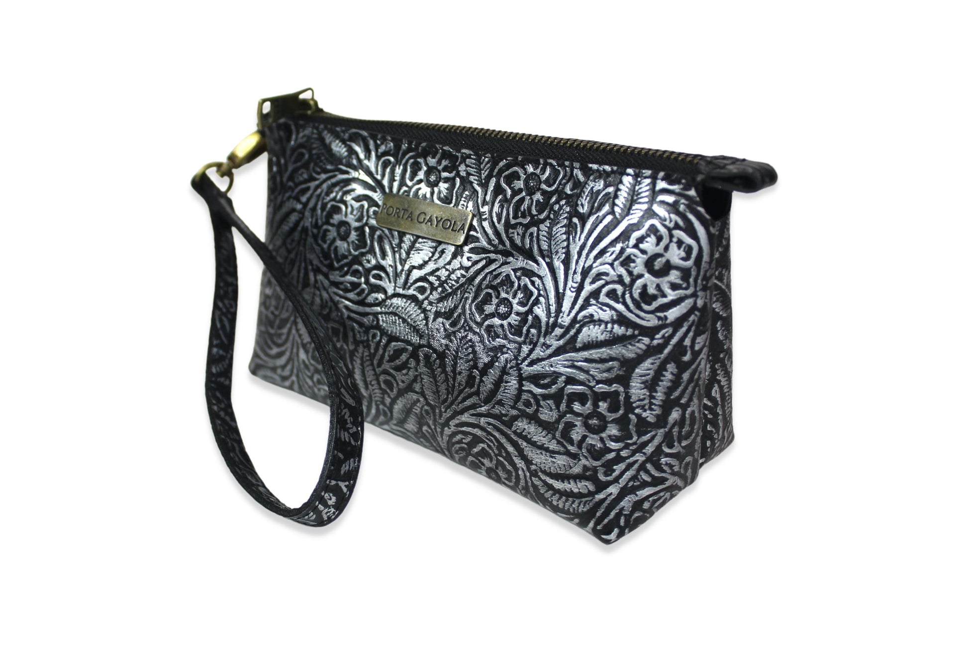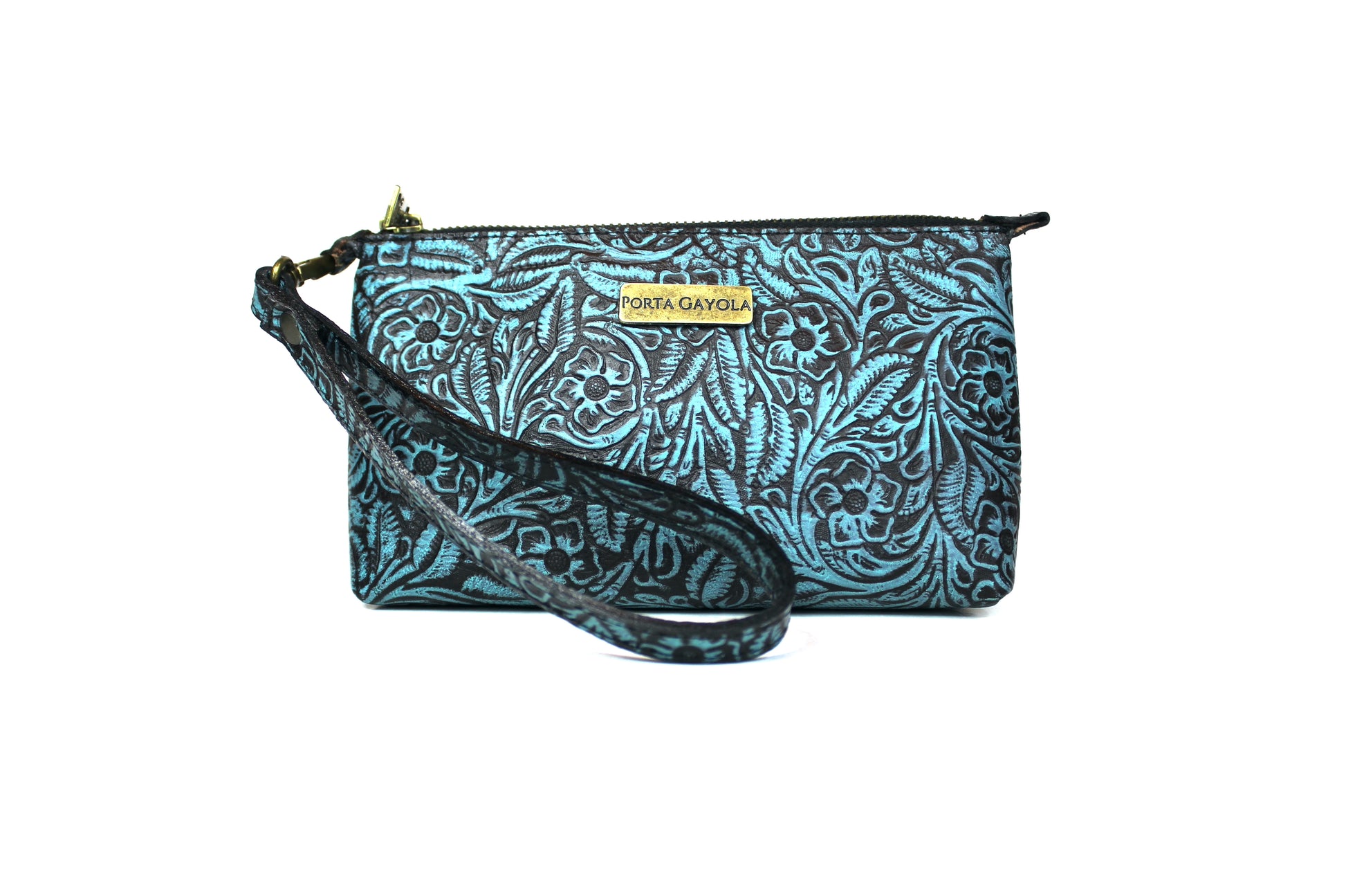 Cosmetiquera con doble oreja para muñequera de piel, en el exterior elaborada con piel grabada y entintada artesanalmente con los 4 colores de nuestra colección.
