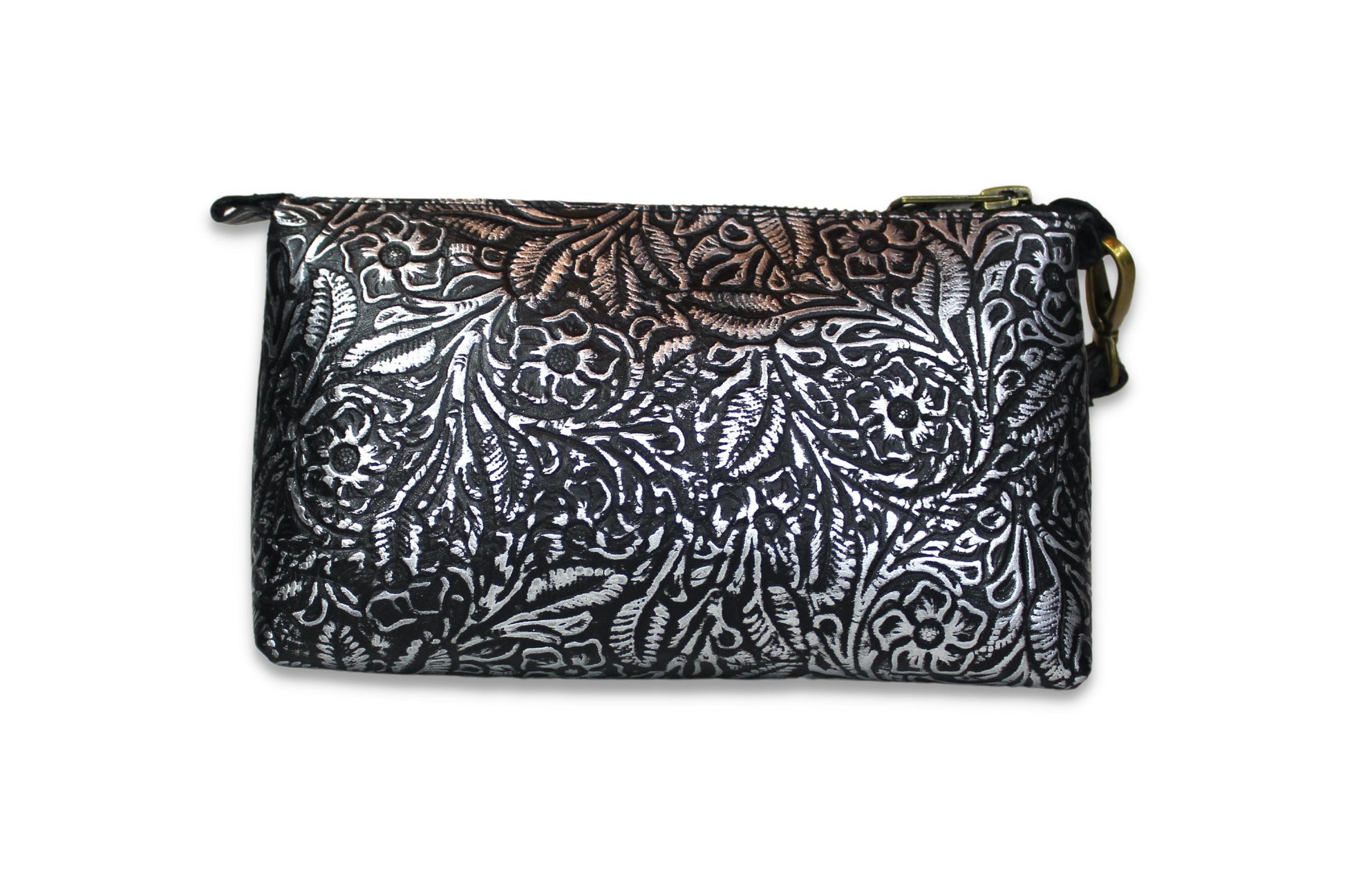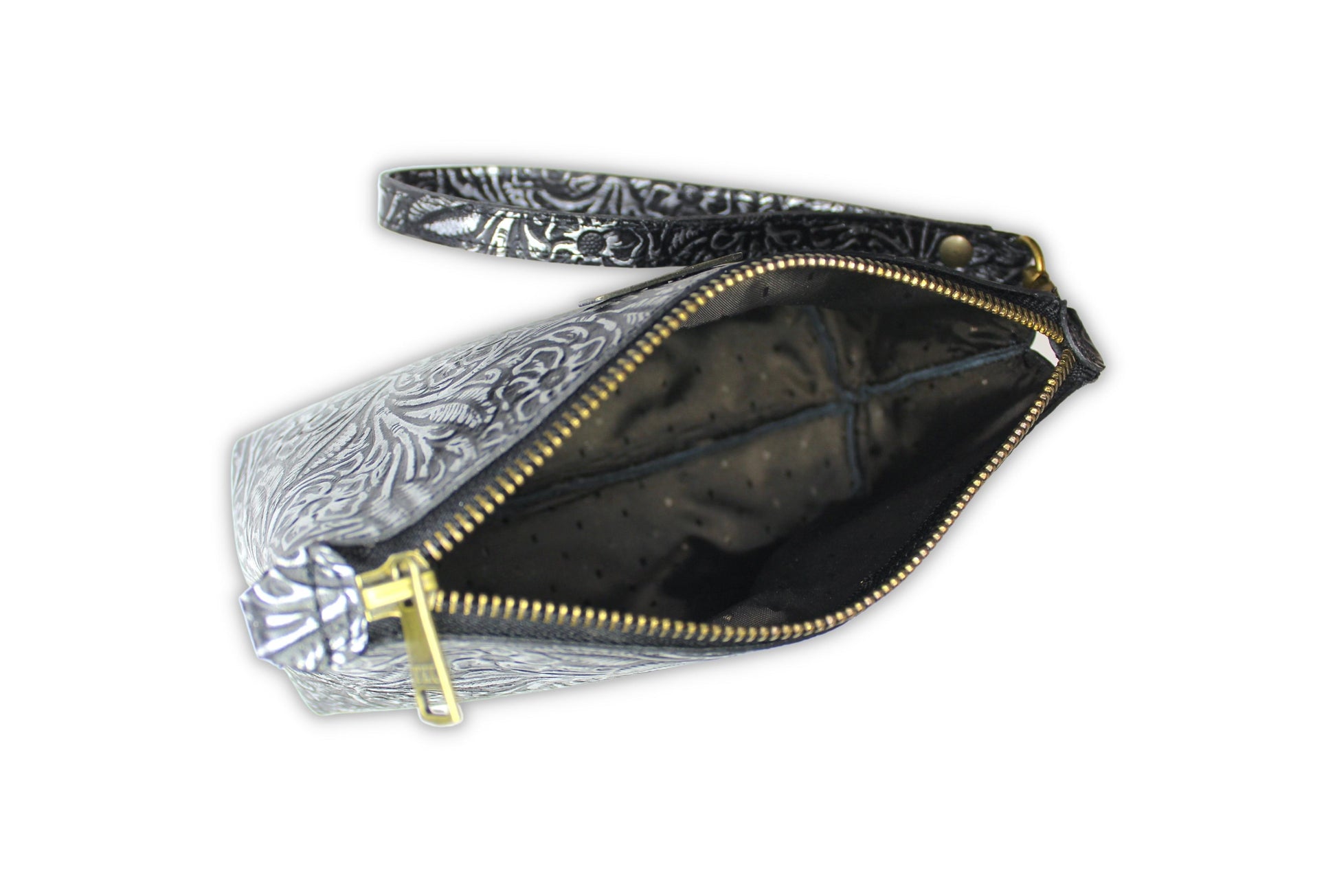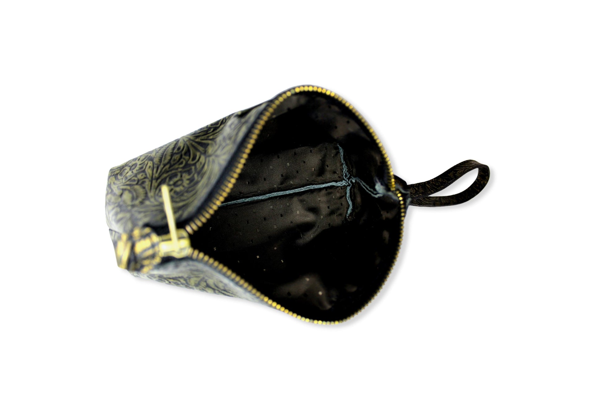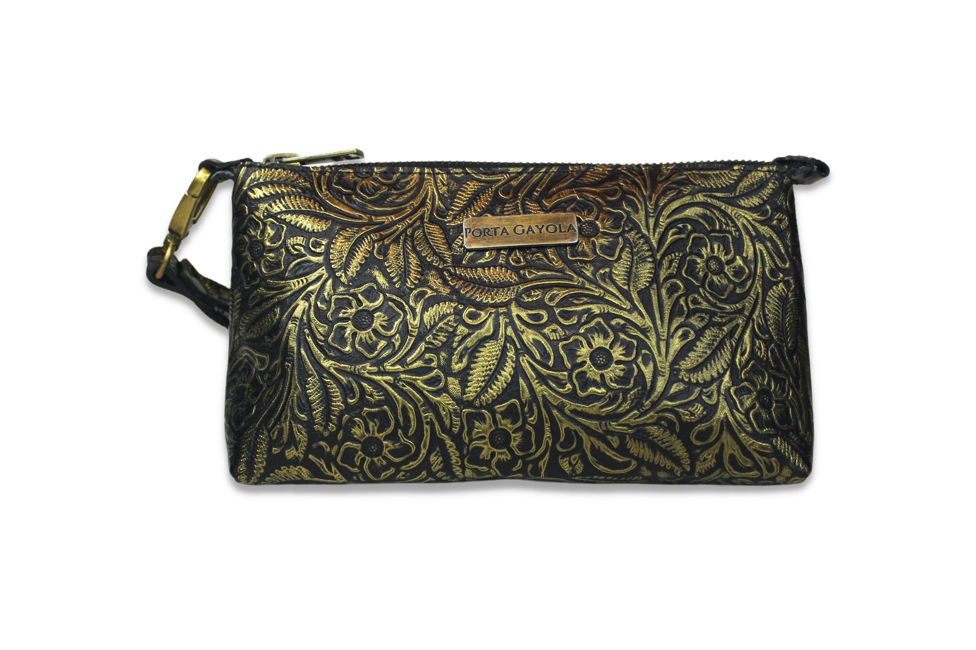 Cosmetiquera con doble oreja para muñequera de piel, en el exterior elaborada con piel grabada y entintada artesanalmente con los 4 colores de nuestra colección.