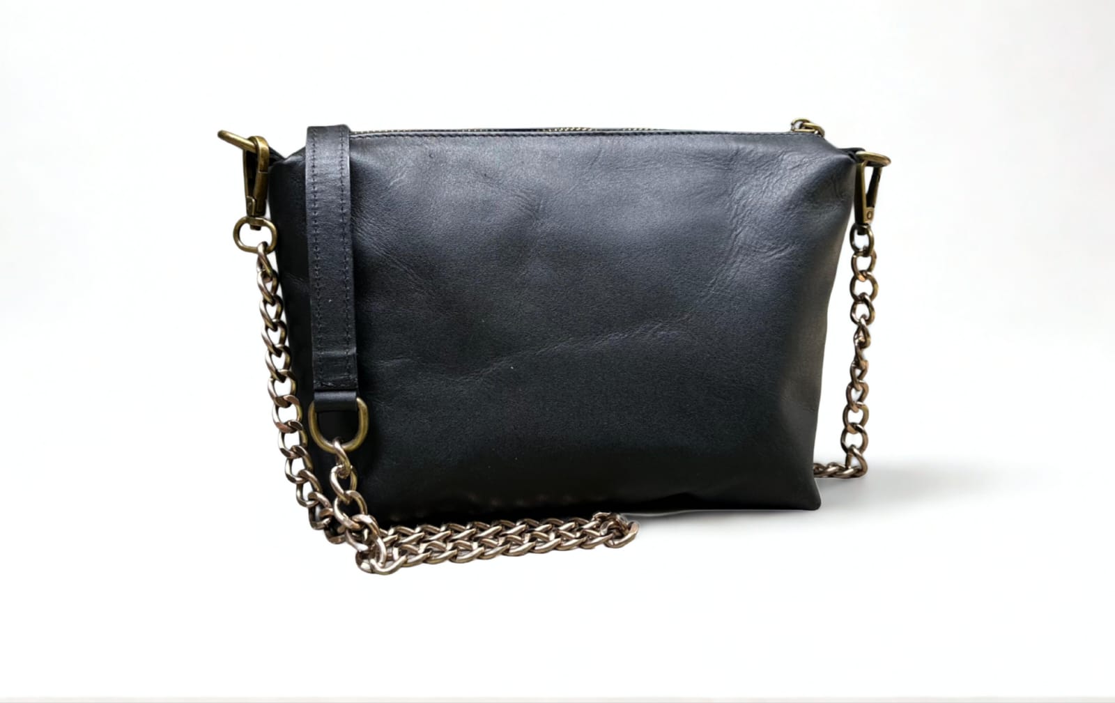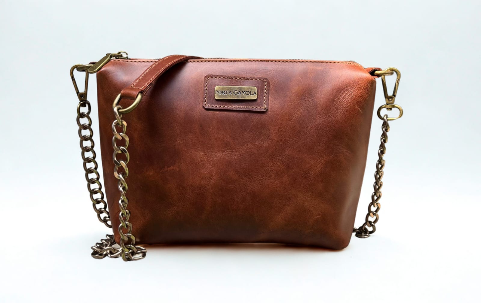 3 bolsillos interiores. Cadena color oro y hombrera de piel.