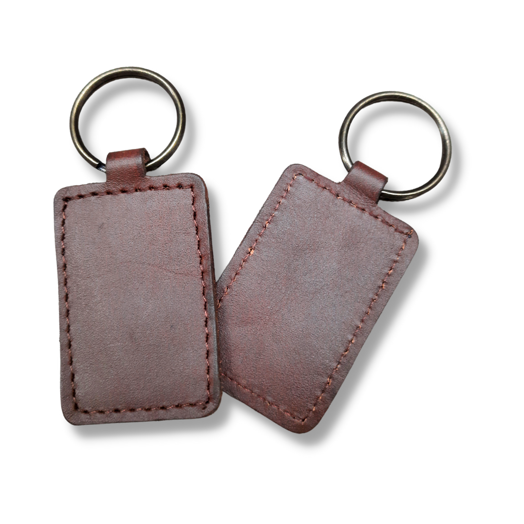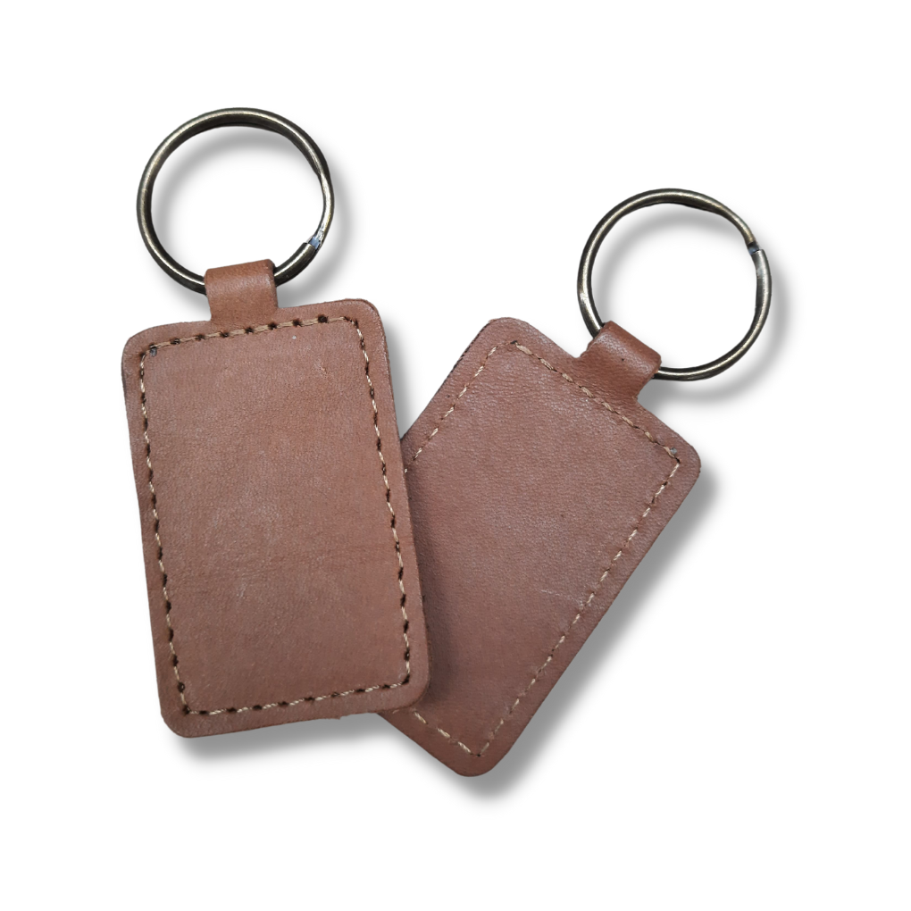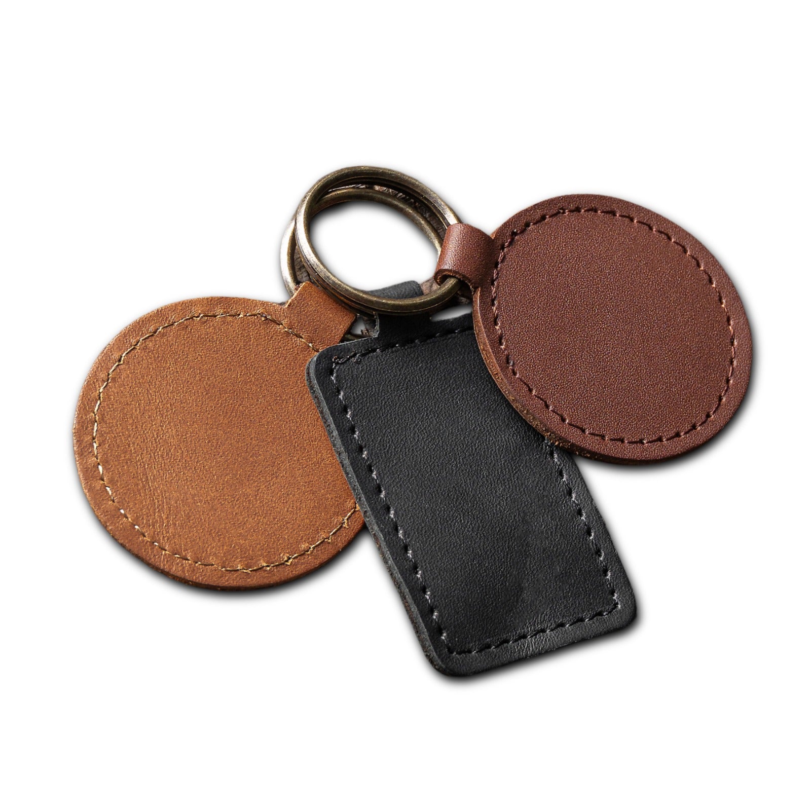 Personaliza tu llavero con tu logo ideal para regalos corporativos en tres diseños diferentes (Circular, Rectangular, Cuero de Vaca) .