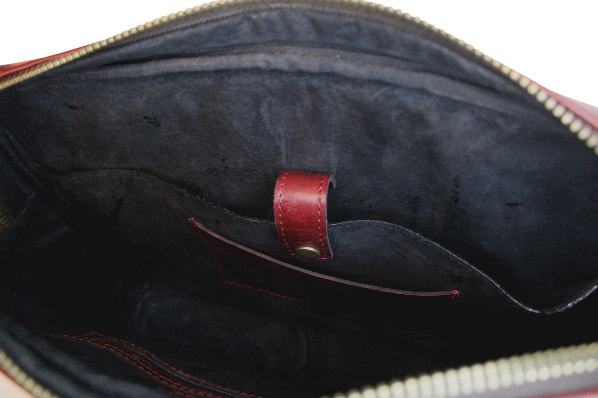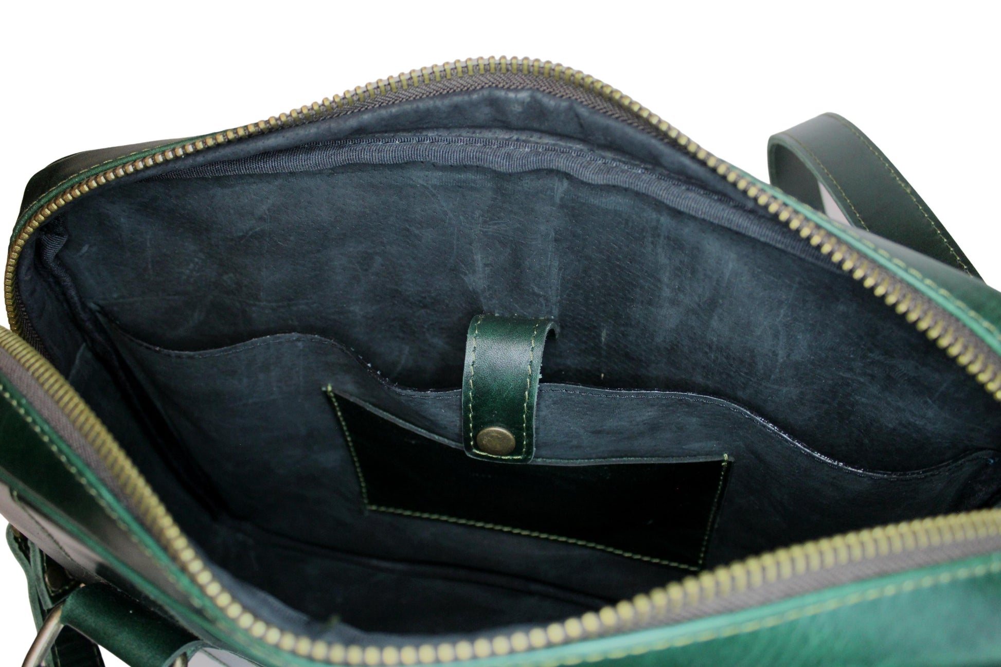 Elegante Maletín de uso diario, elaborado en piel Esmeralda y Tinto 2022 y forro interior de suave piel. Con división interna para Laptop de 15" con broche. Cierres y herrajes vintage.
