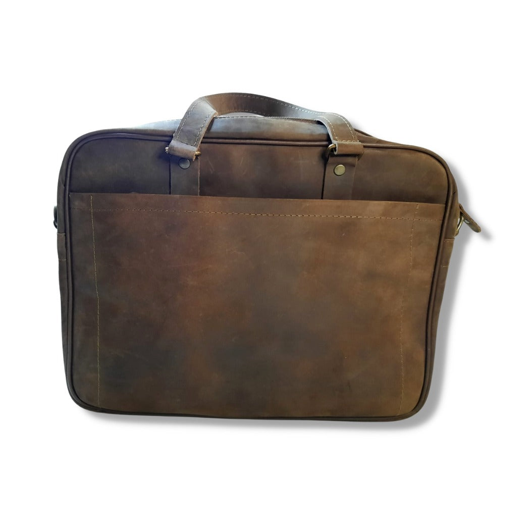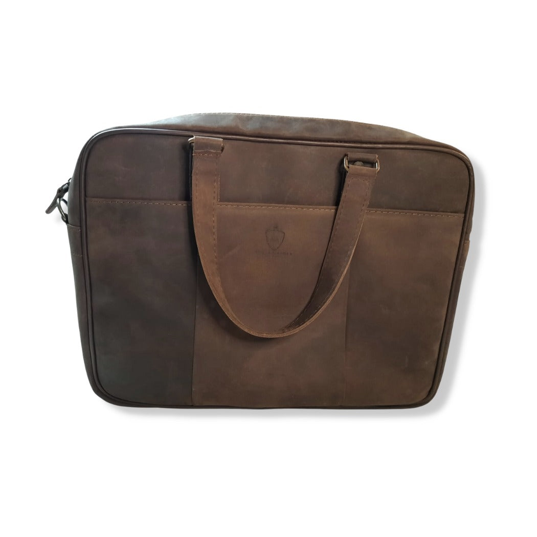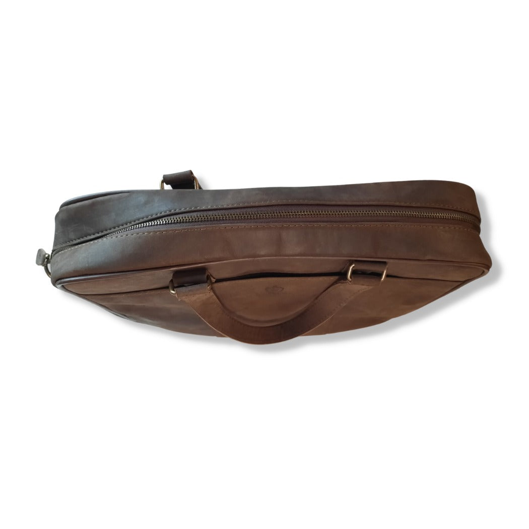 Práctico y completo maletín elaborado en en fina piel, cuenta con un amplio bolso frontal y en la parte trasera un bolso amplio con cierre.